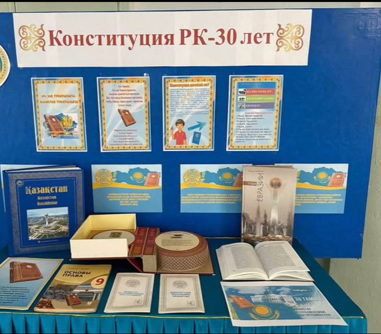 Мектеп кітапханасында "ҚР Конституциясы-30 жыл"атты кітап көрмесі ұйымдастырылды.Кітап көрмесінің мақсаты-Қазақстан Республикасының Конституциясымен танысу және оқушыларға жоғары жауапкершілік пен патриотизмді, Қазақстан азаматтарының бірлігін көрсету. Кітапханашы Копылова К. С.